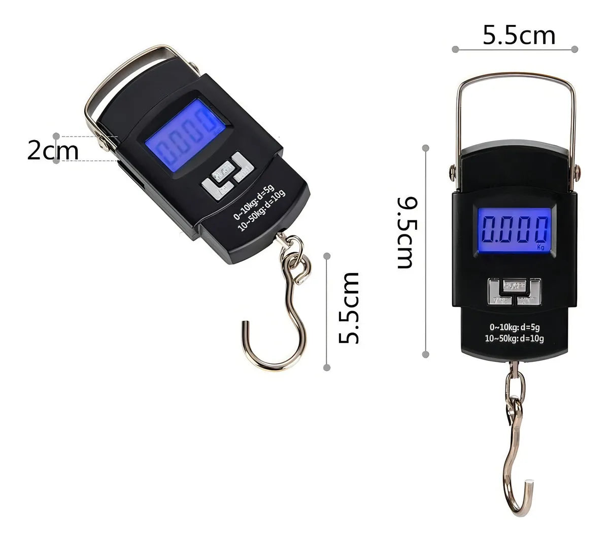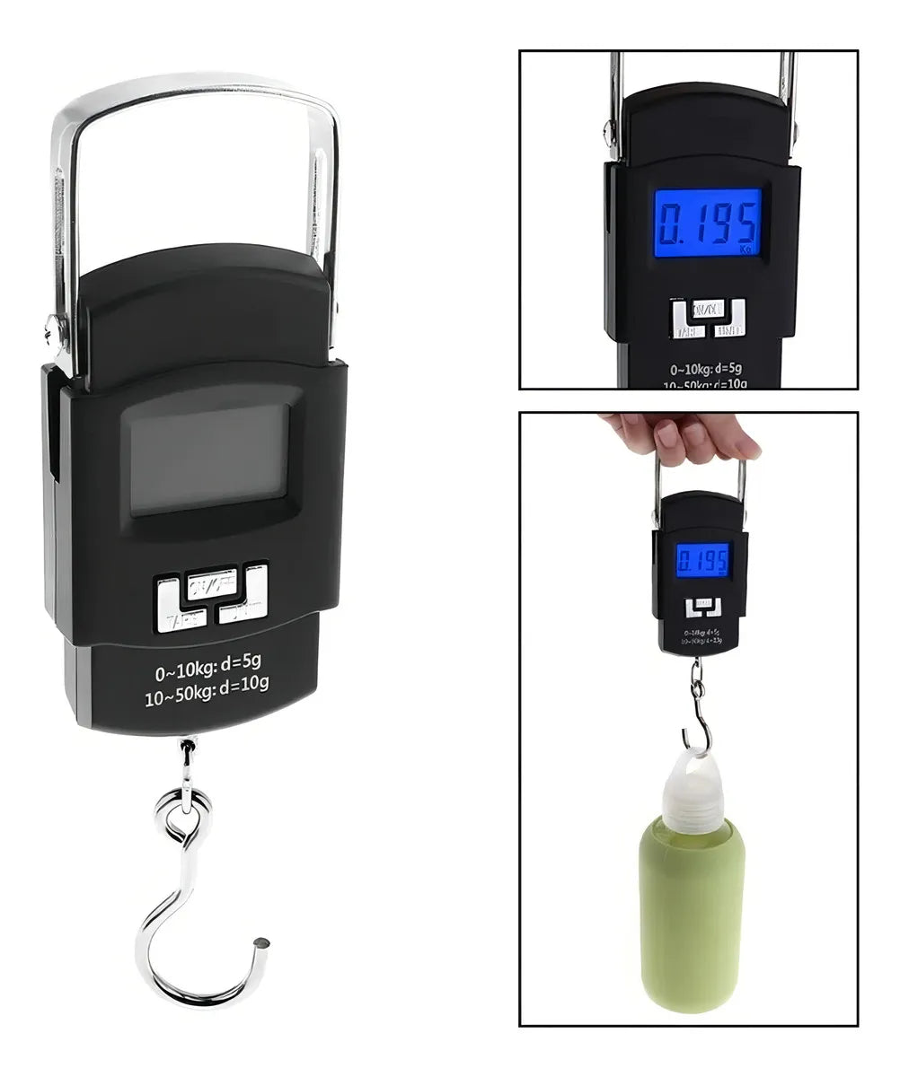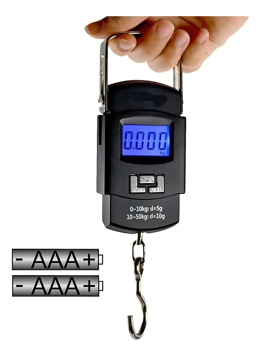 Balanza digital portátil para equipaje con capacidad máxima de 50 kg. Diseño compacto y ligero ideal para viajeros que desean evitar cargos por exceso de peso en aeropuertos. Cuenta con gancho resistente, función tara para descontar pesos innecesarios, pantalla digital clara y funcionamiento con baterías AAA. Proporciona lecturas precisas en kilogramos de forma rápida y confiable.