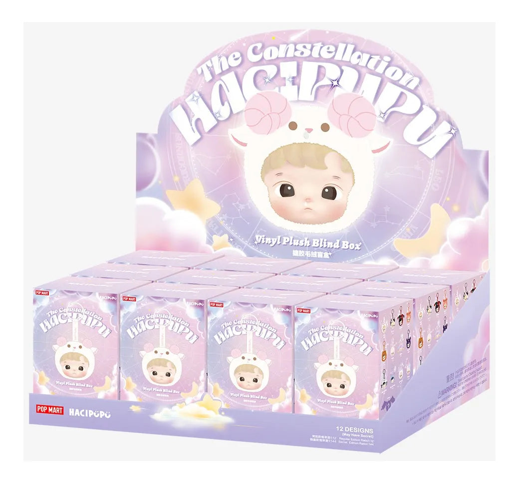 - Caja ciega POP MART HACIPUPU de la serie Constelaciones con figura de vinilo sorpresa. Cada caja contiene una figura aleatoria de las 12 disponibles, con oportunidad de obtener la edición secreta. Elaborado con PVC y ABS de calidad, pintura no tóxica y segura. Perfecto para coleccionistas y como regalo.