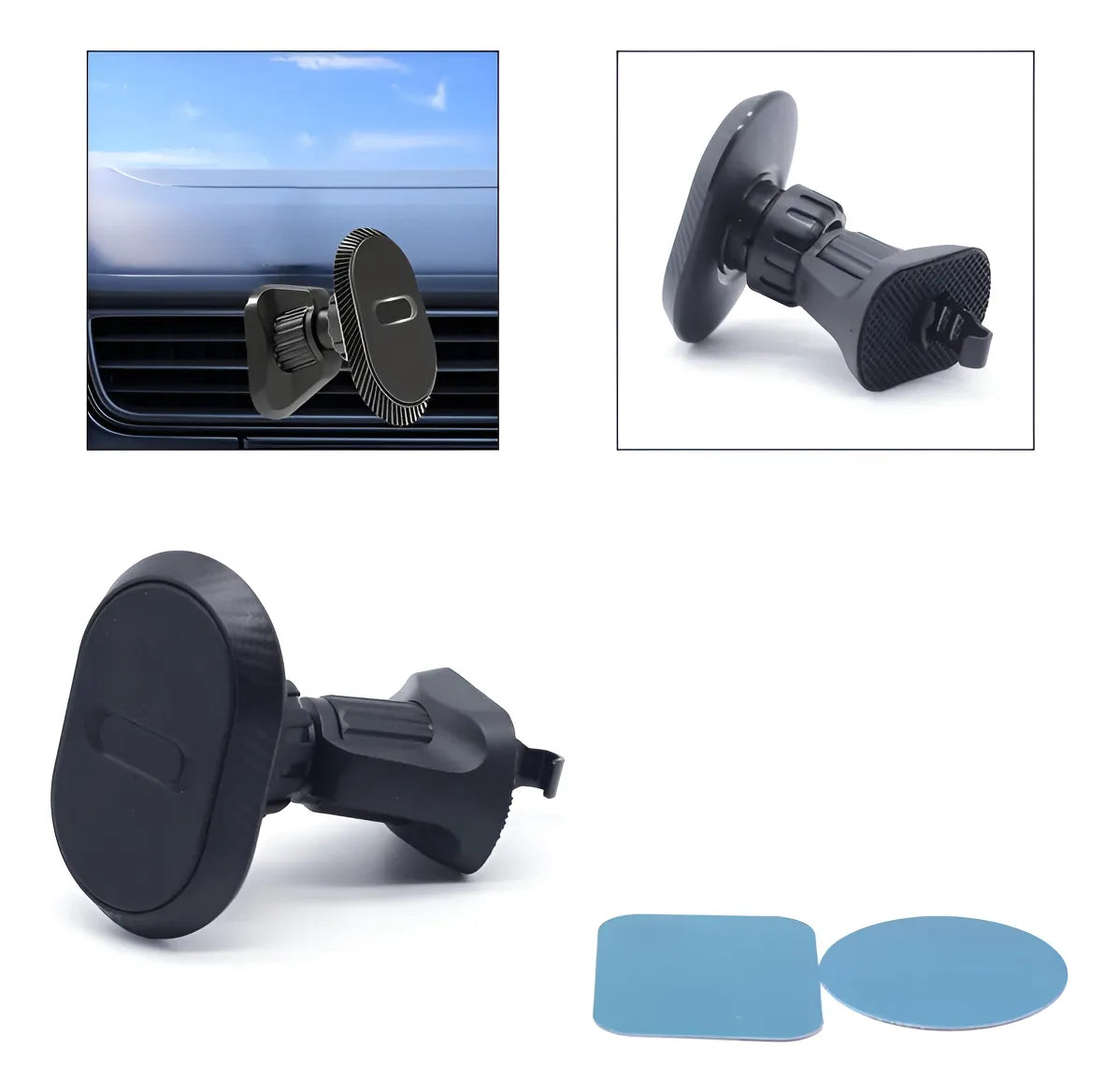 Soporte magnético para celular con imanes de neodimio que aseguran tu smartphone en el auto. Compatible con todos los modelos, se instala en el salpicadero o parabrisas sin herramientas. Rotación de 360 grados para ajustar el ángulo según necesites. Perfecto para navegación y llamadas manos libres mientras conduces.
